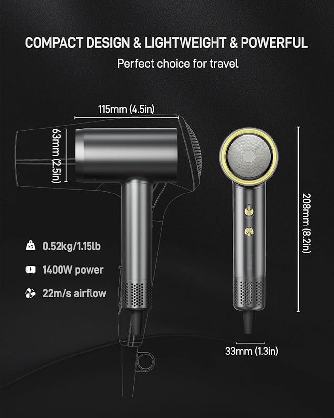 Hair Dryer High Speed Ionic, 110000 RPM Quiet Heat Controlled Blow Dryer Intelligent Fast Drying 1400W Brushless Motor with Diffuser 2 Nozzles, 3 Temps & 2 Speeds