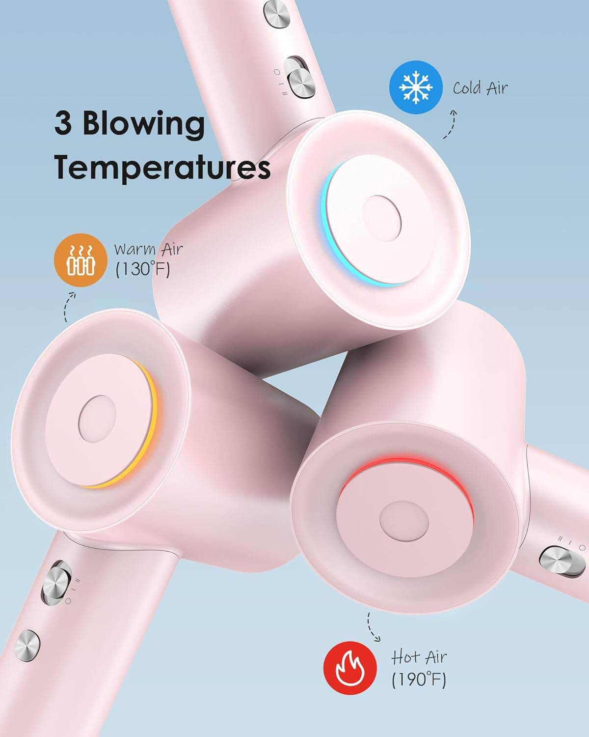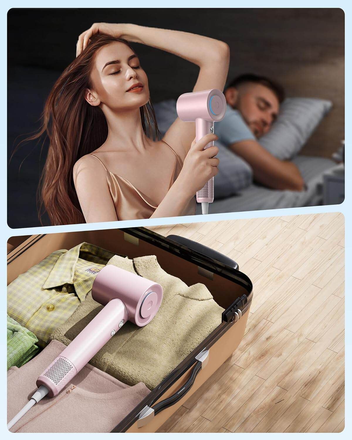 [High-Speed Fast-Drying Hair Dryer]- The motor determines the wind speed of the hair dryer. With a high-speed brushless motor of 110,000RPM, the wind speed can reach 23 M/S from a 10 cm distance to an outlet for many factory tests. Such design speeds up hair drying generally within 2- 8 minutes, depending on hair length & thickness, which is two times faster than traditional blow dryers.[ Eliminate Static Electricity with Negative Ionic Technology]-TruStrand professional hair dryer can release 200 million negative ions and water vapor particles, which is conducive to neutralizing the positive charges that often exist in the hair—avoiding static electricity and making your hair silky without frizz, pairing hair mask hair conditioner for better results.[Thermo Control Technology]- Hairdryer regulates the heat through a high-performance chip control system. Avoid overheating damage to hair and protect hair. The temperature of a traditional hair dryer is between 302℉ and 392℉, which will cause irreversible thermal damage to hair. Our hair dryer has 3 different LED lights built in, and you can turn the LEDs into different colors by switching the heat button. Red is hot, yellow is warm, and blue is cold. Press 3s to active cold and hot circulate[Super Safe & Warm Service]-FCC certified, the high-speed hair dryer has a temperature control switch, a built-in Temperature sensor, a double-layer magnetic suction nozzle, over-current protection, and over-voltage protection. Filter mesh is very close and won't suck hair. Combined with a fire-resistant casing- it keeps you and your devices completely safe. If you have any problems with further use, contact us, we will reply within 24 hours.[Lightweight & Portable]-Weighs only 0.9lb, it's a lightweight and portable travel hair dryer. The Ergonomic design handle feels better than folding ones. TruStrand hair dryer can be used at home or while traveling, which is an excellent Christmas present for your lovers.