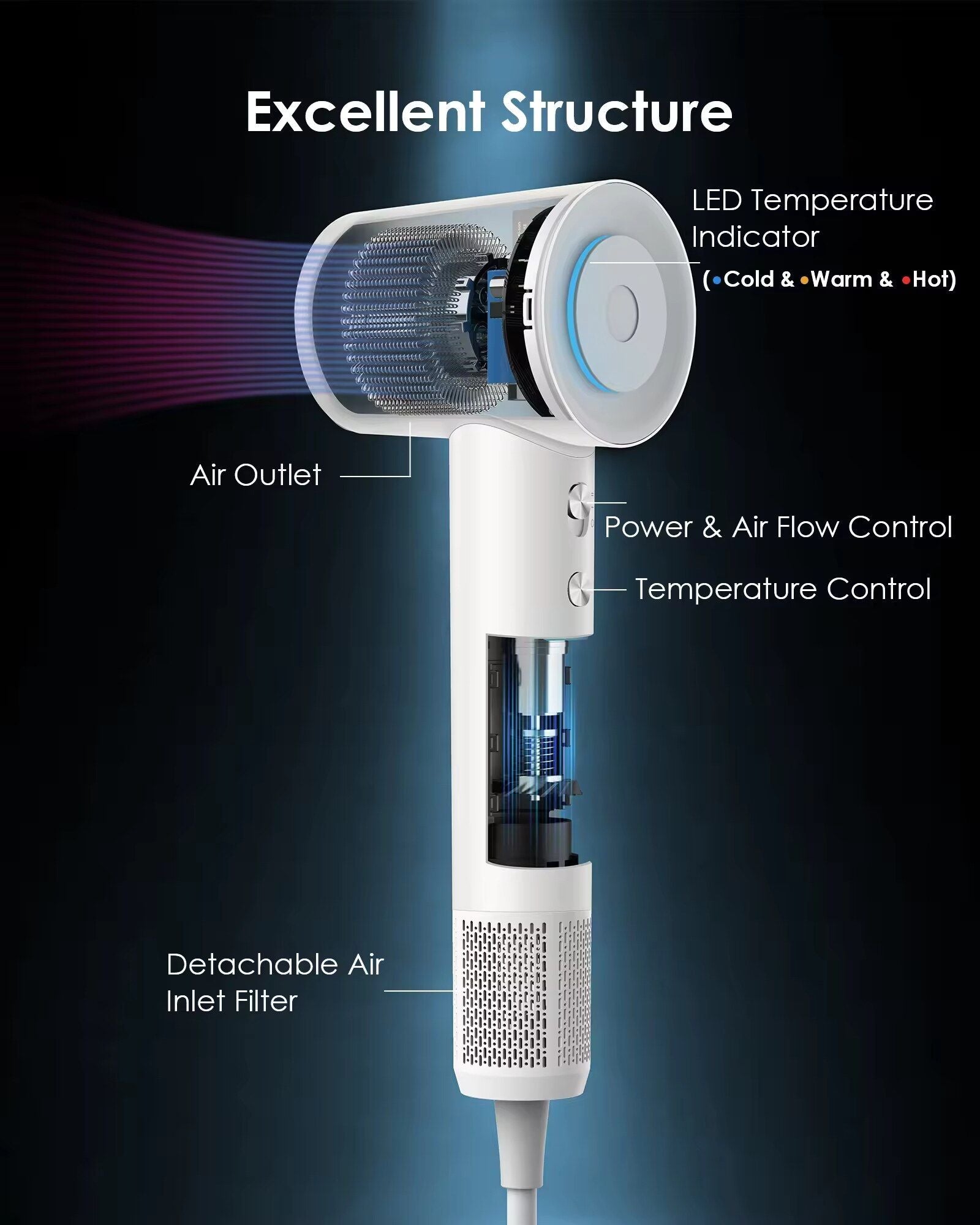 [High-Speed Fast-Drying Hair Dryer]- The motor determines the wind speed of the hair dryer. With a high-speed brushless motor of 110,000RPM, the wind speed can reach 23 M/S from a 10 cm distance to an outlet for many factory tests. Such design speeds up hair drying generally within 2- 8 minutes, depending on hair length & thickness, which is two times faster than traditional blow dryers.[ Eliminate Static Electricity with Negative Ionic Technology]-TruStrand professional hair dryer can release 200 million negative ions and water vapor particles, which is conducive to neutralizing the positive charges that often exist in the hair—avoiding static electricity and making your hair silky without frizz, pairing hair mask hair conditioner for better results.[Thermo Control Technology]- Hairdryer regulates the heat through a high-performance chip control system. Avoid overheating damage to hair and protect hair. The temperature of a traditional hair dryer is between 302℉ and 392℉, which will cause irreversible thermal damage to hair. Our hair dryer has 3 different LED lights built in, and you can turn the LEDs into different colors by switching the heat button. Red is hot, yellow is warm, and blue is cold. Press 3s to active cold and hot circulat [Super Safe & Warm Service]-FCC certified, the high-speed hair dryer has a temperature control switch, a built-in Temperature sensor, a double-layer magnetic suction nozzle, over-current protection, and over-voltage protection. Filter mesh is very close and won't suck hair. Combined with a fire-resistant casing- it keeps you and your devices completely safe. If you have any problems with further use, contact us, we will reply within 24 hours.[Lightweight & Portable]-Weighs only 0.9lb, it's a lightweight and portable travel hair dryer. The Ergonomic design handle feels better than folding ones. TruStrand hair dryer can be used at home or while traveling, which is an excellent Christmas present for your lovers.